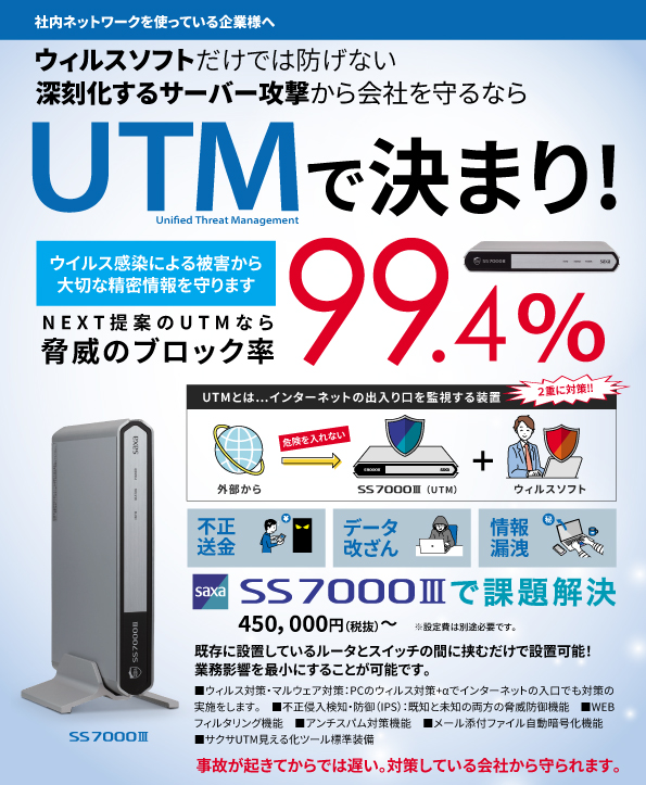 「SS7000III」などのUTM(統合脅威管理)を導入することで、さまざまな外部の脅威から社内ネットワークを保護します。