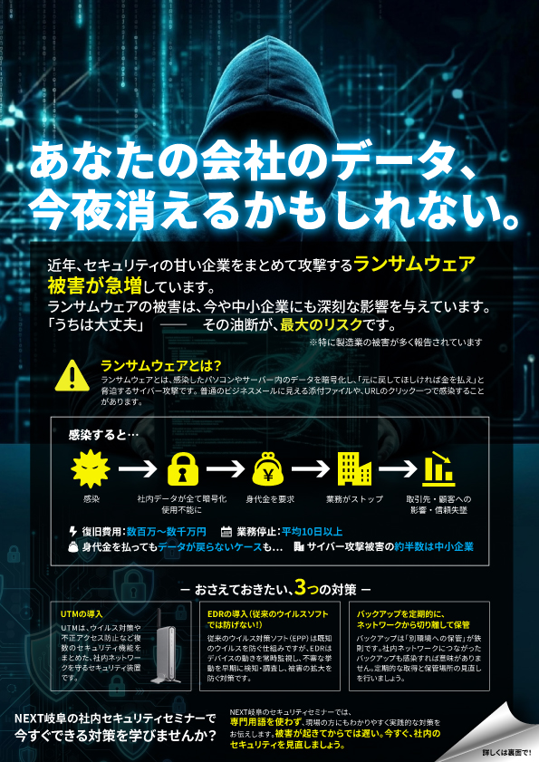 不可欠な課題となっています。NEXT岐阜では、ハードウェアによるネットワーク防御と、従業員の意識を高める教育セミナーの両面から、御社のセキュリティレベル向上を強力にバックアップします。